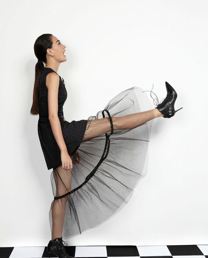在这组大片中,徐璐身着的经典黑色机车夹克无疑是核心焦点。皮质的犀利光泽与铆钉、拉链等金属元素的结合,完美诠释了摇滚风格的核心精神——不羁与反叛。这种单品自带故事感和力量感,能将穿着者的气质瞬间从柔美拉向飒爽。徐璐巧妙地将这件充满攻击性的外套与简约的黑色内搭相结合,避免了过度堆砌的俗套,反而更突出了她清晰的面部轮廓和坚定的眼神,一种“柔中带刚”的独特魅力油然而生。