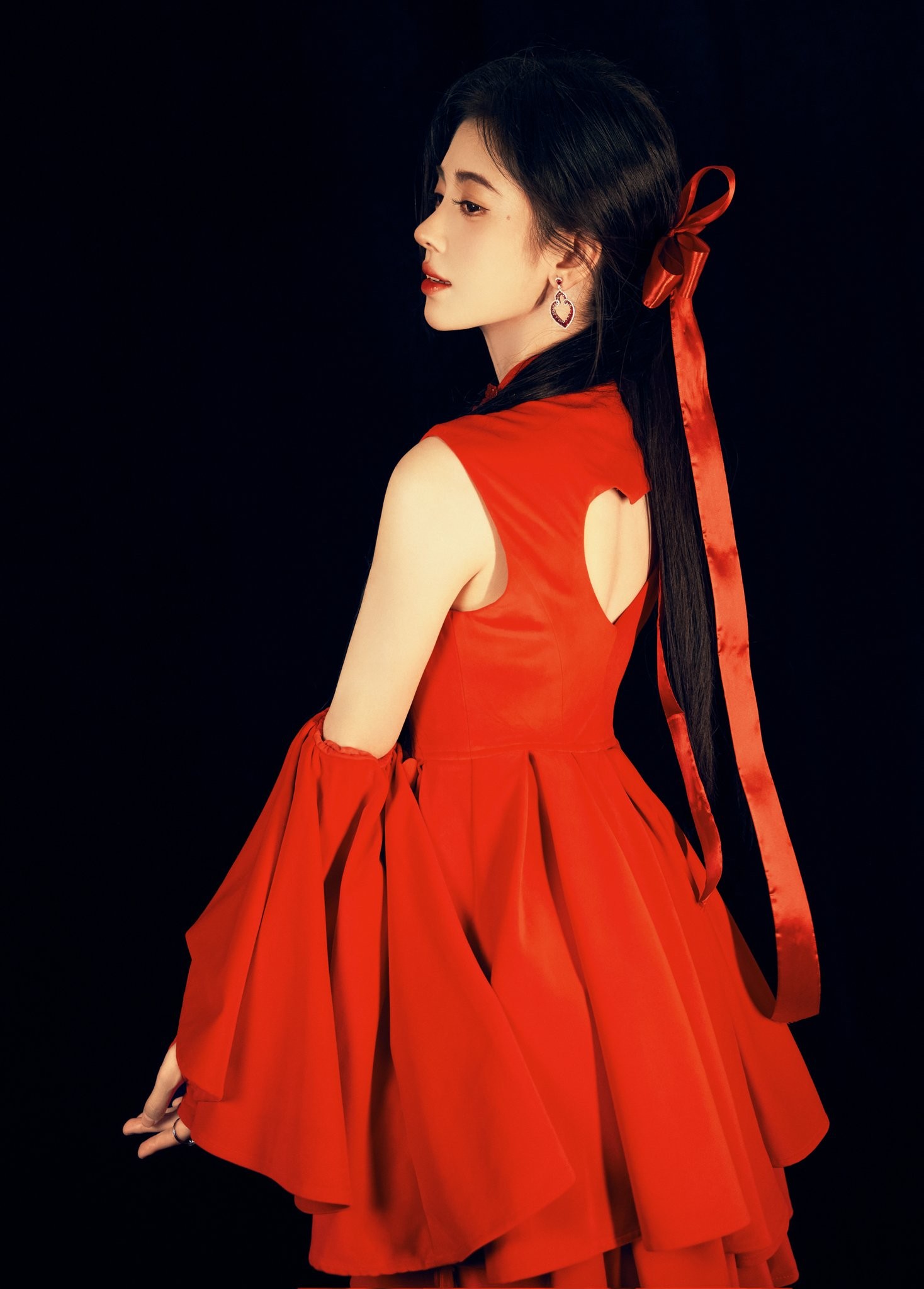 除了服装本身,妆发造型也极大地强化了整体的古典氛围。鞠婧祎的妆容以精致清丽为主,柳叶细眉,朱唇一点,与鲜艳的红裙形成对比,更衬得她肌肤胜雪,面容姣好。发型则多采用古典盘发或垂坠感的造型,点缀以简约的发簪或珠饰,既有大家闺秀的端庄,又不失少女的婉约。这种在细节上的用心,使得每一张照片都仿佛在诉说着一个关于东方美人的故事。