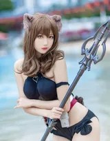 天火在《明日方舟》中是一位出身维多利亚、拥有地质学与源石地质学双学位的天才术师,她是民间源石技艺研究组织的核心成员,也是王者之杖派驻罗德岛的首席术师。在游戏中,她以强大的群体法术攻击和控场能力著称。而这套在2019年“火蓝之心”夏日活动中推出的“温差”泳装皮肤,一经公布便因其大胆而精致的设计成为了无数博士心心念念的收藏品。此次高质量的真人cosplay,正是对这一人气皮肤的深情致敬。