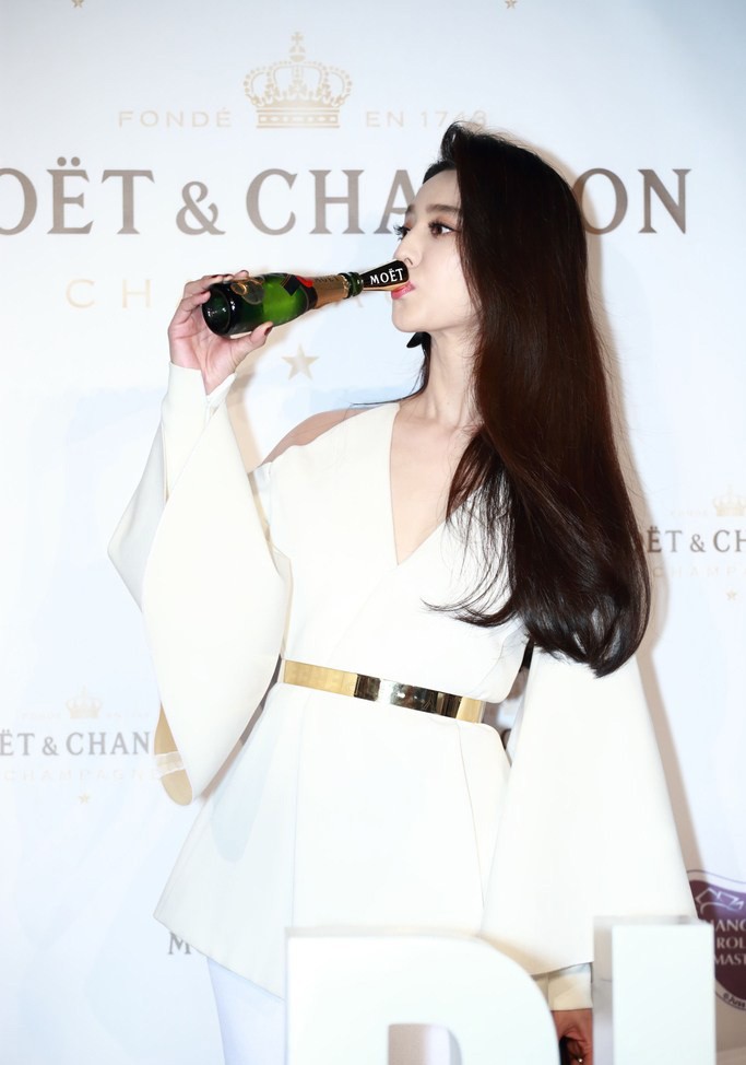 这组“深V套装秀香肩举酒瓶豪饮”的写真,之所以能给人留下深刻印象,在于它成功地将多重元素融合在了一起:高级时装带来的距离感,被一个率性的动作拉近;女性柔美的身体线条,与豪饮所暗示的刚强性格形成碰撞。这种矛盾与统一,塑造了一个立体、丰富、不被定义的范冰冰形象。