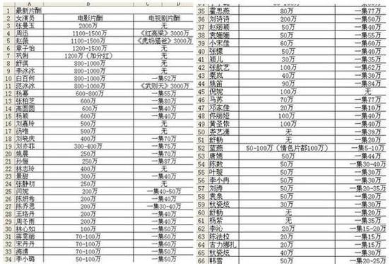 与此同时,另一份更具体的名单也在网络上流传。有报道称,林志玲的饭局价最高叫到500万一次,目前维持在80万左右;范冰冰所谓的“社交活动”身价也高达62万;身材火辣的柳岩则从10万涨到了100万-4。