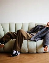 写真的场景设定在居家空间,这是最能展现一个人真实状态的地方。照片中的马柏全,或倚窗沉思,或席地而坐,或翻阅书籍,每一个瞬间都被捕捉得自然而不造作。环境中的木质家具、柔软地毯、散落的靠枕以及温暖的灯光,共同构建了一个安全、放松的私域场景。在这里,他褪去了演员的职业光环,就像任何一个享受周末闲暇时光的大男孩,流露出未经雕琢的真诚与安静。这种“去表演化”的呈现,反而让观者感受到了更强的感染力和共鸣,仿佛我们看到的不是一位明星,而是隔壁那位温暖又好看的学长。