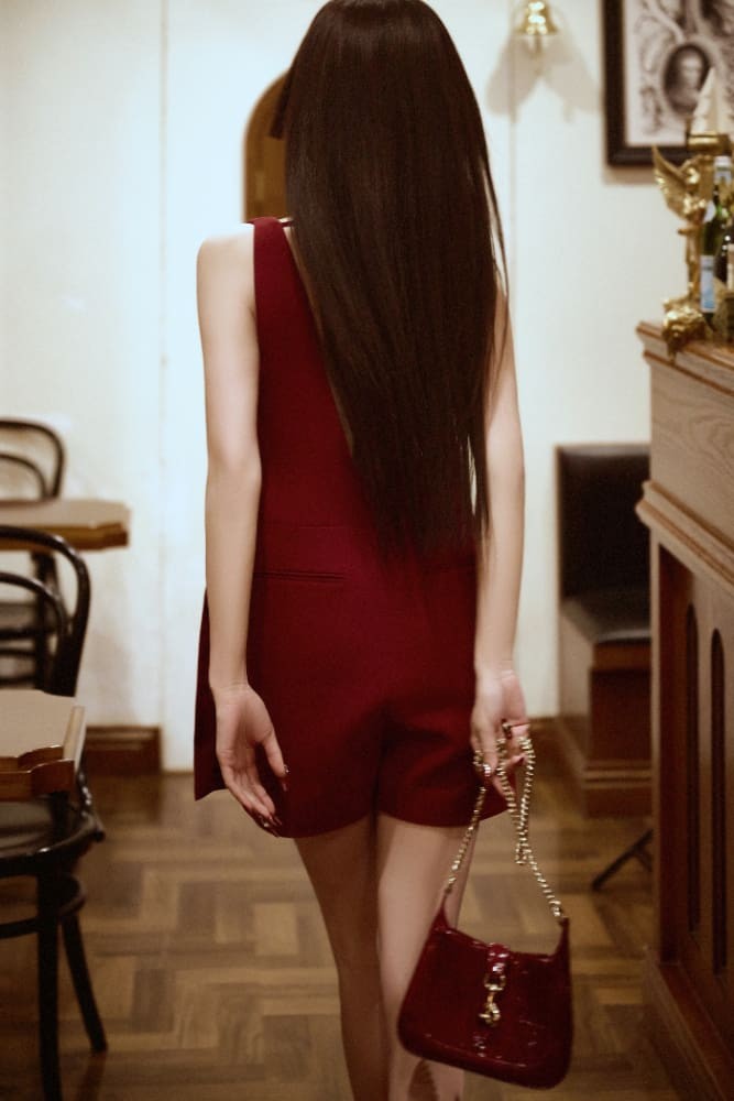 此次白鹿的造型,完美诠释了萨巴托·德·萨尔诺所倡导的“减法美学”。与过去几年古驰繁复复古的风格不同,新系列强调精准的剪裁、上乘的面料和实穿的比例。这款连体裤在设计上做足了减法,摒弃了多余的装饰,仅凭流畅的线条和恰到好处的露肤度来展现高级感。利落的深V领口延伸了颈部的线条,宽肩设计强调了力量感,而收腰与垂坠的裤腿则勾勒出女性的修长与柔美。整体廓形既简约又极具张力,正如总监本人所说,焦点回归到服装本身。