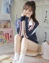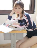 人物的表现则是写真的灵魂。模特并非通过夸张的造型或姿态夺人眼球,而是凭借极其自然的状态打动人。无论是倚在课桌旁的俏皮沉思,还是对着镜头绽放的毫无阴霾的笑容,都流露着发自内心的轻松与愉悦。这种自然感,与当下流行的“元气学姐”风格不谋而合——不过分甜腻,也不故作严肃,而是知性与活力的融合,充满能量感。她的肢体语言舒展而生动,仿佛下一秒就会从画面中走出,带着一阵清新的风。